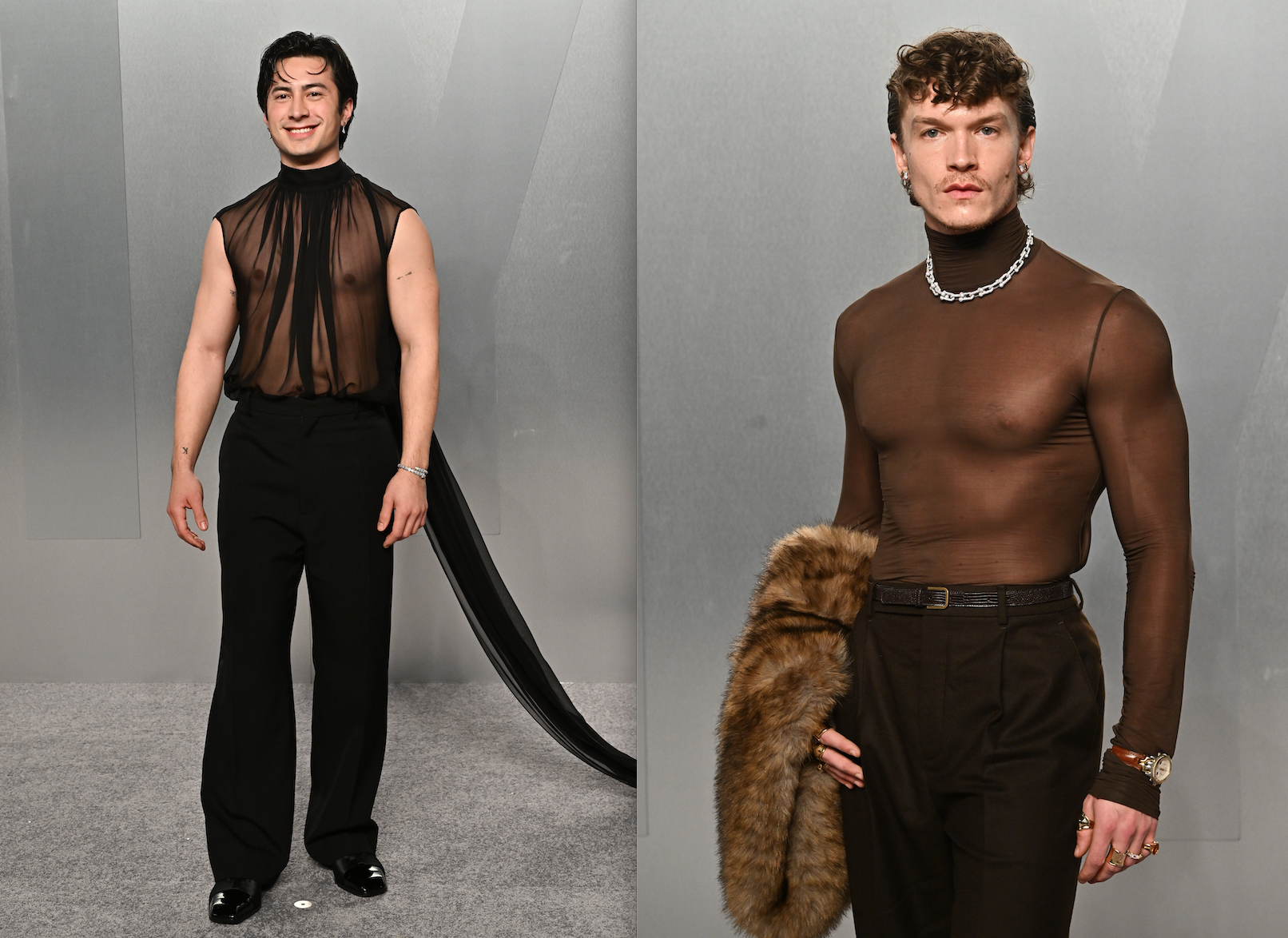 Connor Storrie var klädd i genomskinlig topp och svarta byxor, Saint Laurent från topp till tå. Han besökte dock inte själva galan vilket Hudson Williams gjorde. Där valde han helsvart signerat Balenciaga med smyckeshuset Bvalgari som accessoarer, och till Vanity Fair-festen blev det likt sin motspelare genomskinligt av samma modehus. Enligt alla modesidor på nätet verkar det som att killarna var helrätt i sina kroppsavslöjande val.