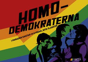 Under själva paraden kommer de dela ut regnbågsflaggor med två ”unga HBT-are” som motiv och texten ”Homodemokraterna – i paraden kastar vi kyssar, inte flaskor”.