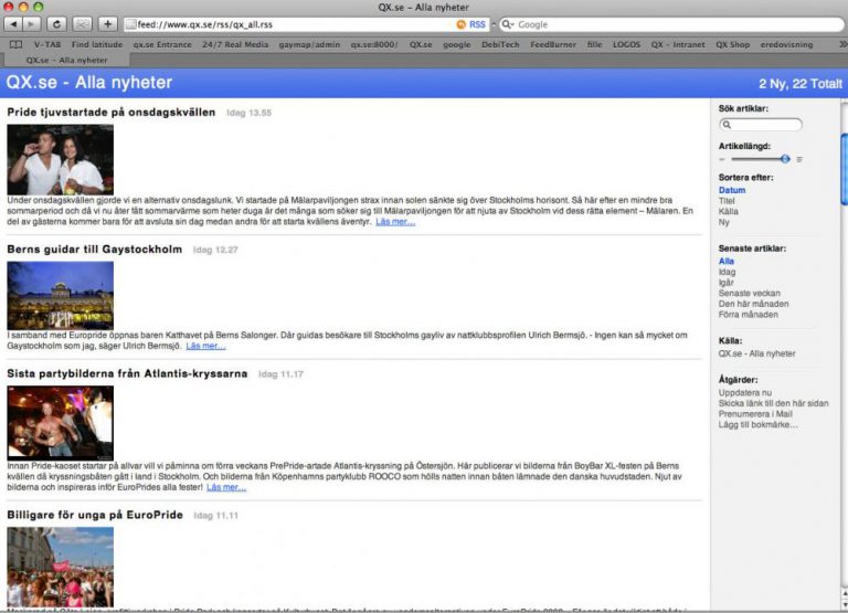 RSS-flödet för QX.se kan antinget läsas/prenumerars på för alla nyheter, eller uppdelat på avdelningarna Sport, Resor, Nöje, Kultur, Samhälle och EuroPride 08.